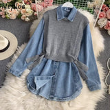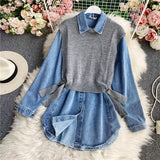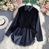 Neploe Chic Fake Two Piece Turn-down Collar All-match Shirts 2021 Knitted Patchwork Jeans Blouses Women Casual Slim Blusas 1H847